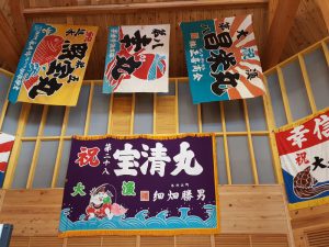 入るとすぐに大漁旗がいっぱい!!
